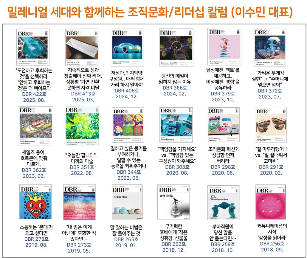 - 이수민 대표가 DBR(동아비즈니스리뷰)에 연재하고 있는 《조직문화와 리더십》 관련 칼럼 내용을 중심으로 하되, 다양하고 복잡한 현실 상황에 적합한 실제적인 코칭으로 진행합니다.